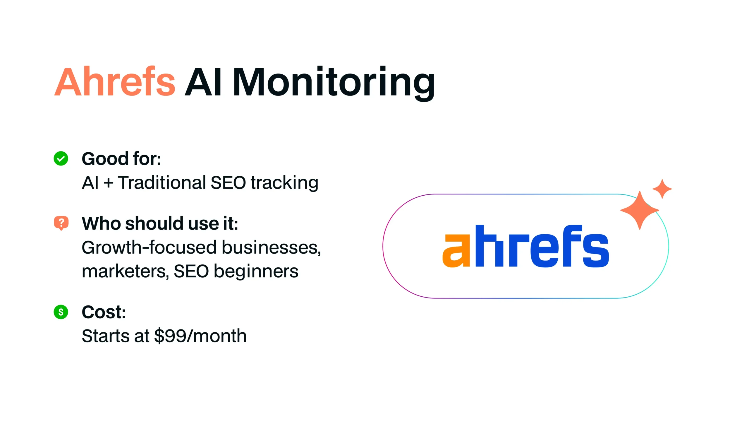 Ahrefs AI Monitoring | SEO + AI search tracking | $99/month | Competitor tracking, AI overview visibility | Low–Medium |