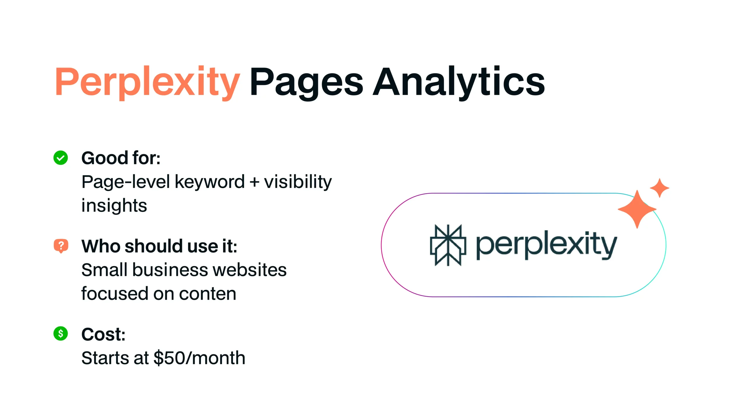 Perplexity Pages Analytics | Page-level AI visibility analysis | $50/month | Keyword performance, optimization suggestions | Low |