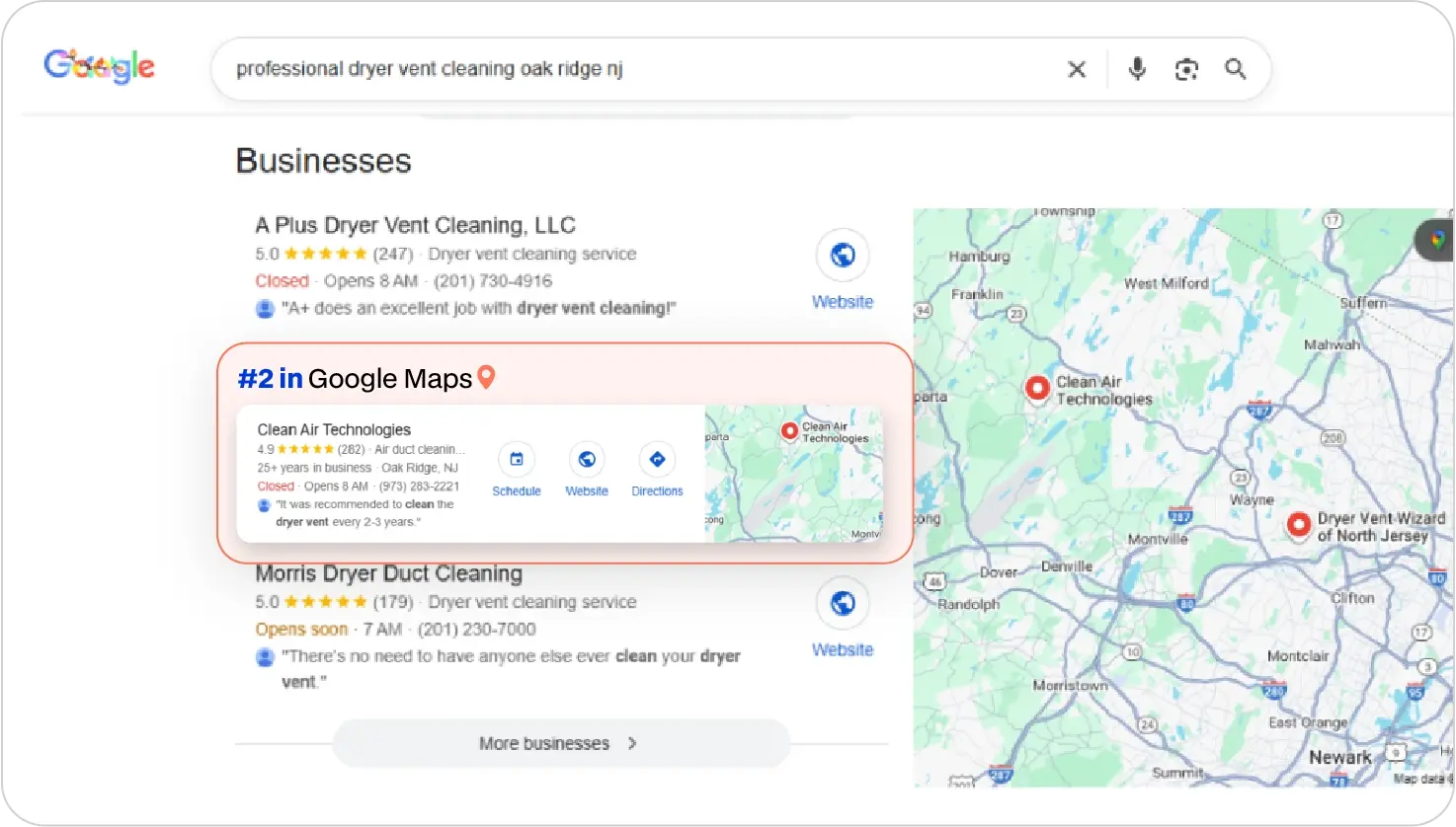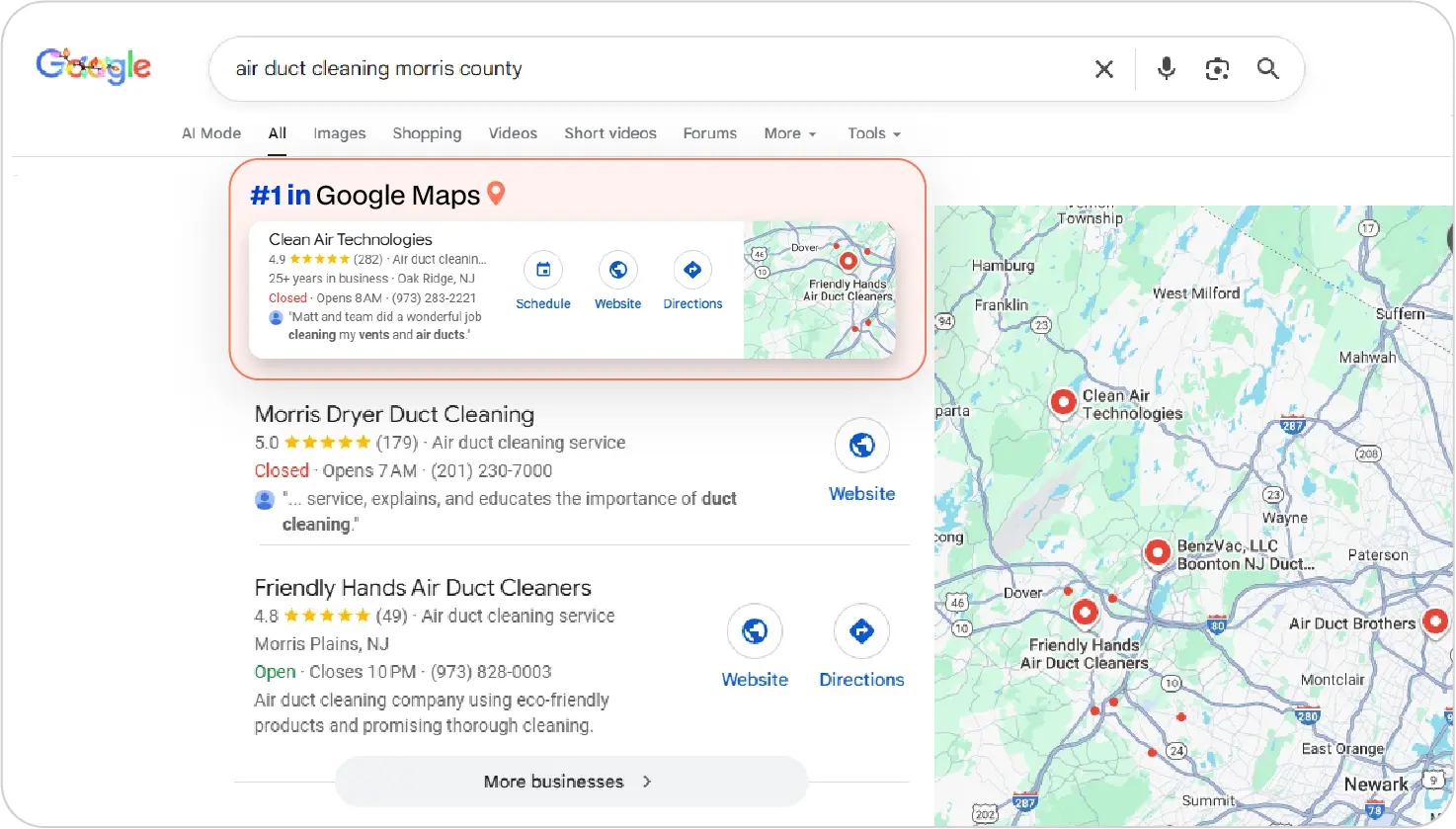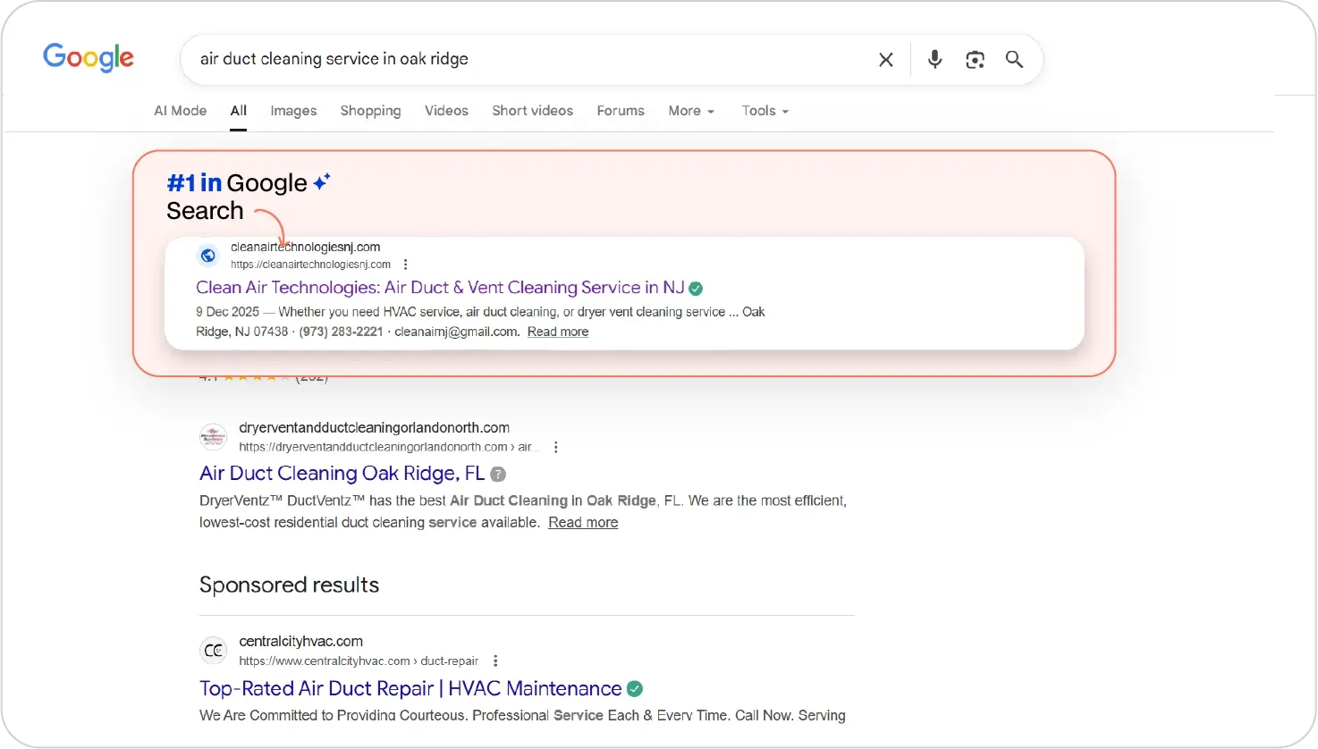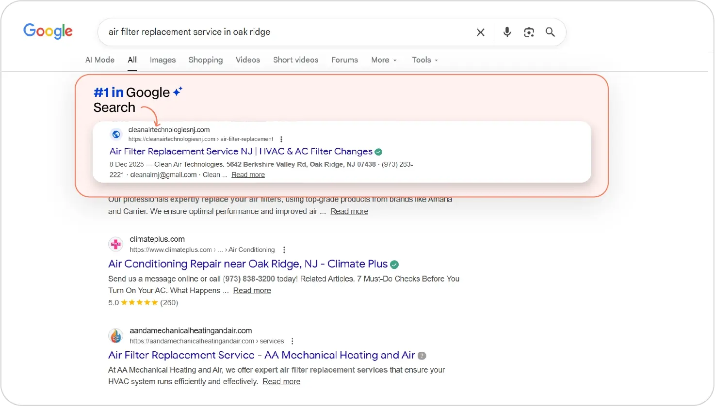 Clean Air Technologies’ Google Business Profile consistently ranks in the top 3 positions in Google’s local pack for some of the most competitive and high-intent searches in their market.