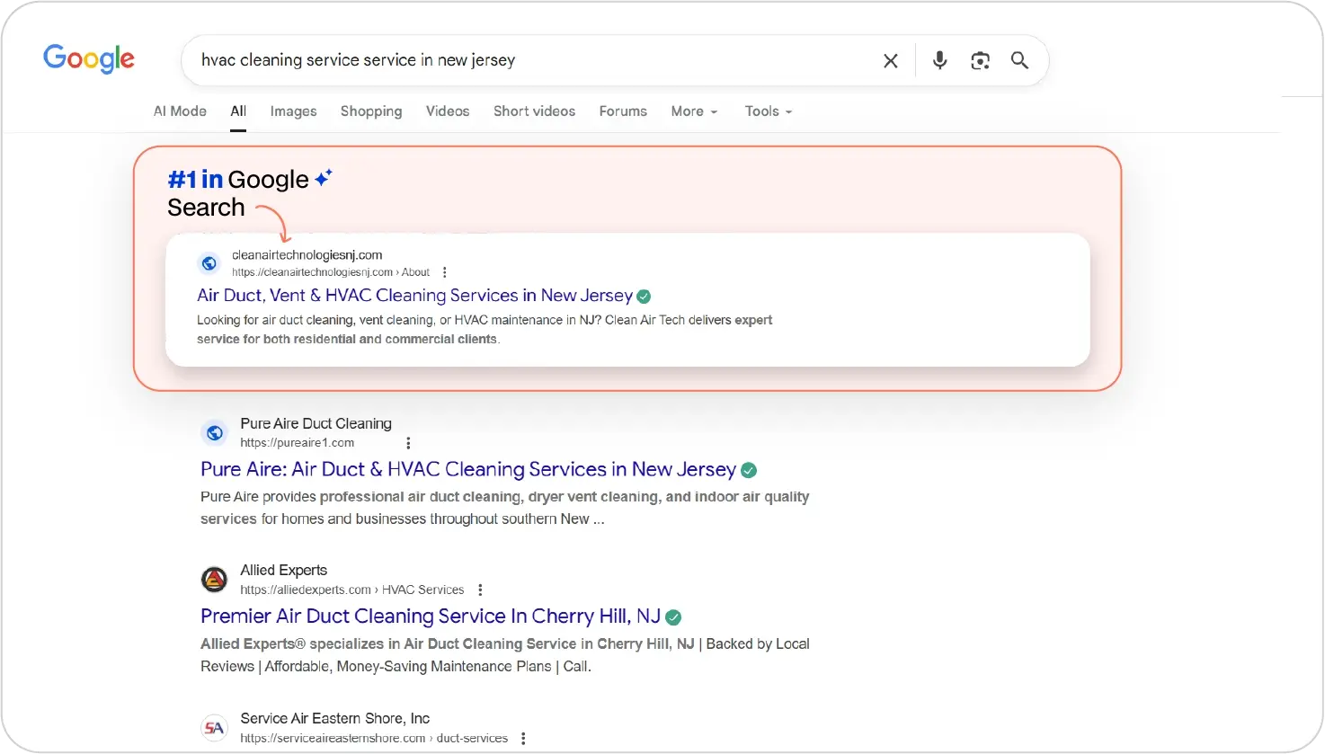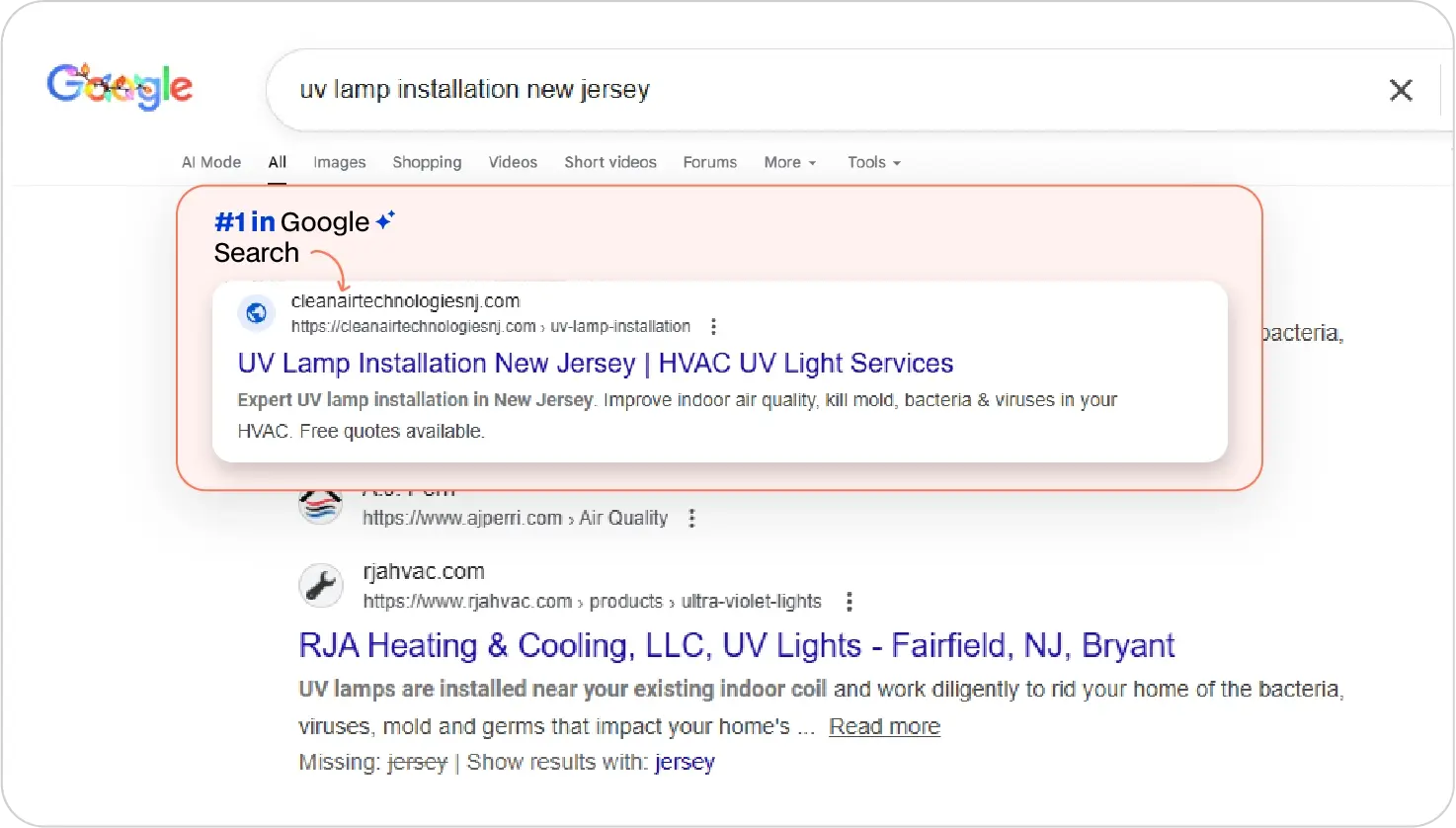 Next, we optimized all service pages for high-intent local keywords and created multiple location-specific pages targeting the New Jersey counties, cities, and towns Clean Air Technologies serves.