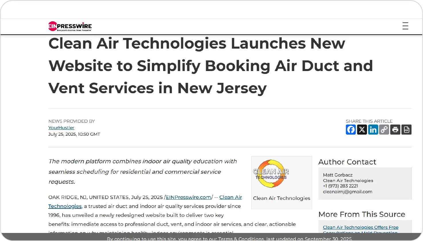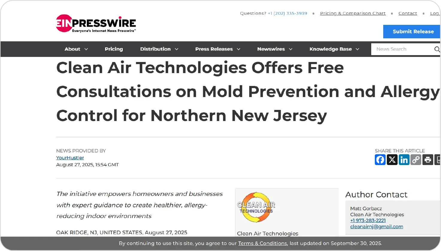 We undertook targeted PR campaigns to boost Clean Air Technologies’ credibility and visibility across New Jersey. We did press releases on platforms like EIN Presswire to highlight the company’s initiatives like free consultations for mold prevention, air quality assessments in schools and senior centers, and more.